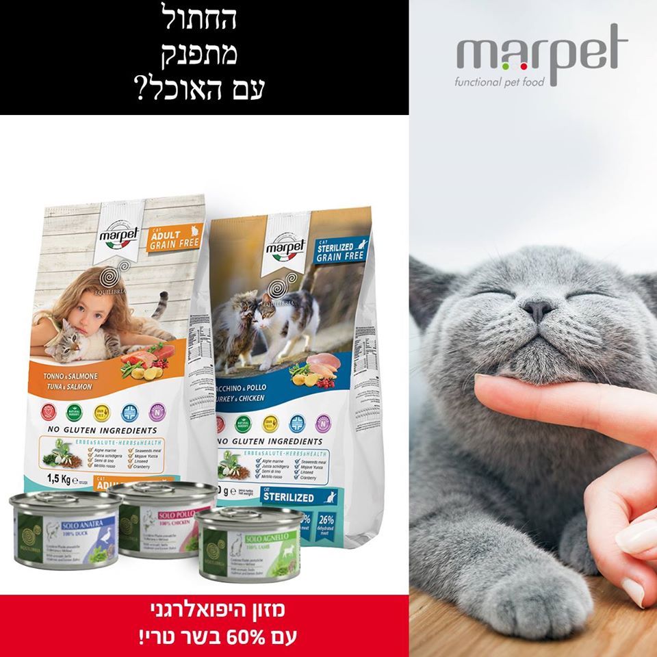 'אקוליבריה' - מזון חתולים היפואלרגני עם 60% בשר טרי, ללא דגנים ובתוספת צמחי מרפא. מגיע במגוון טעמים מפתים :)